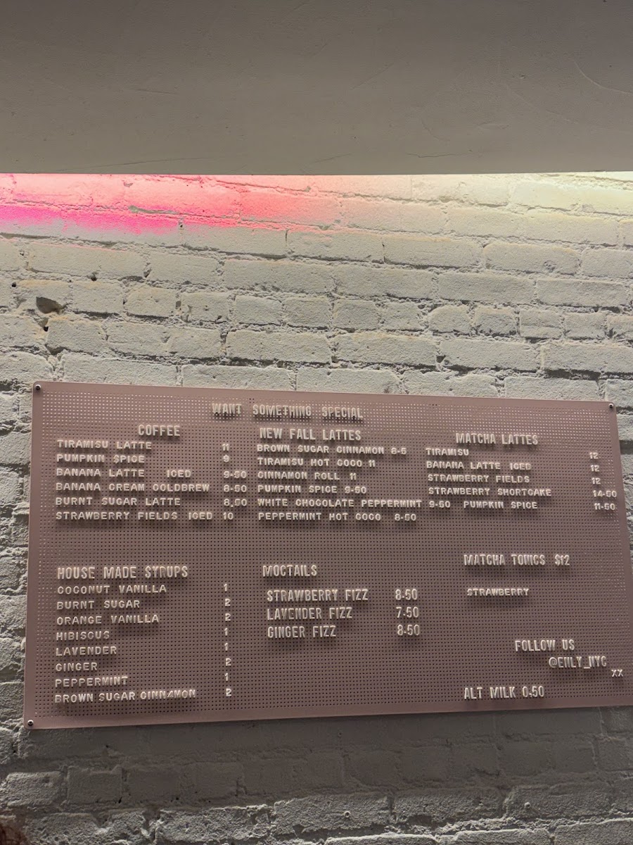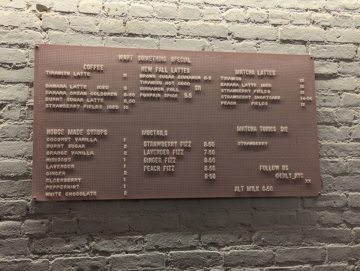 Overall, the menu highlights drinks that balance rich flavors with a touch of sweetness, making them suitable for both morning pick-me-ups and afternoon breaks. While the café leans toward coffee favorites, the unique flavors and neatly presented drinks add a simple sense of occasion to everyday moments.
